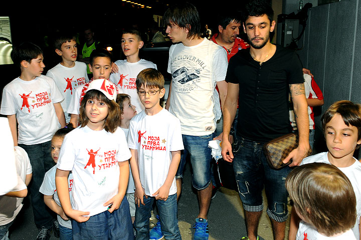 На клупи за играче...  На атлетској стази...  На трави поред грба...  Сликање поред омиљеног грба  На клупи...  Касалица потписује мајицу  Каду и Стојковић са малишанима  Роберт Просинечки  Просинечки потписује мајице  Деца са фудбалерима  Весић, Тошић, Ожеговић, Ђуричковић и Мирић